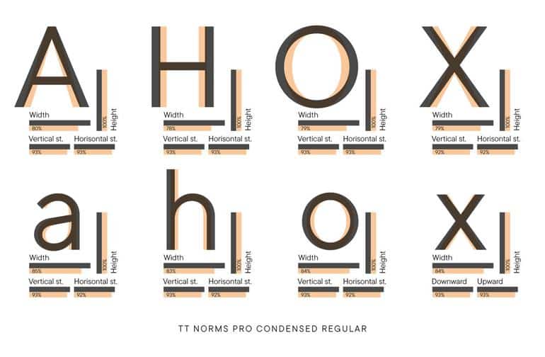 Началась работа над TT Norms® Condensed с тщательного исследования. Арт-директор студии изучила все гротески крупных студий, включая узкие версии. В процессе анализа было выяснено, какие значения оптимальны для сужения, чтобы сохранить визуальную гармонию и уникальность шрифта, а при каких условиях рисунок шрифта будет сильно искажаться.