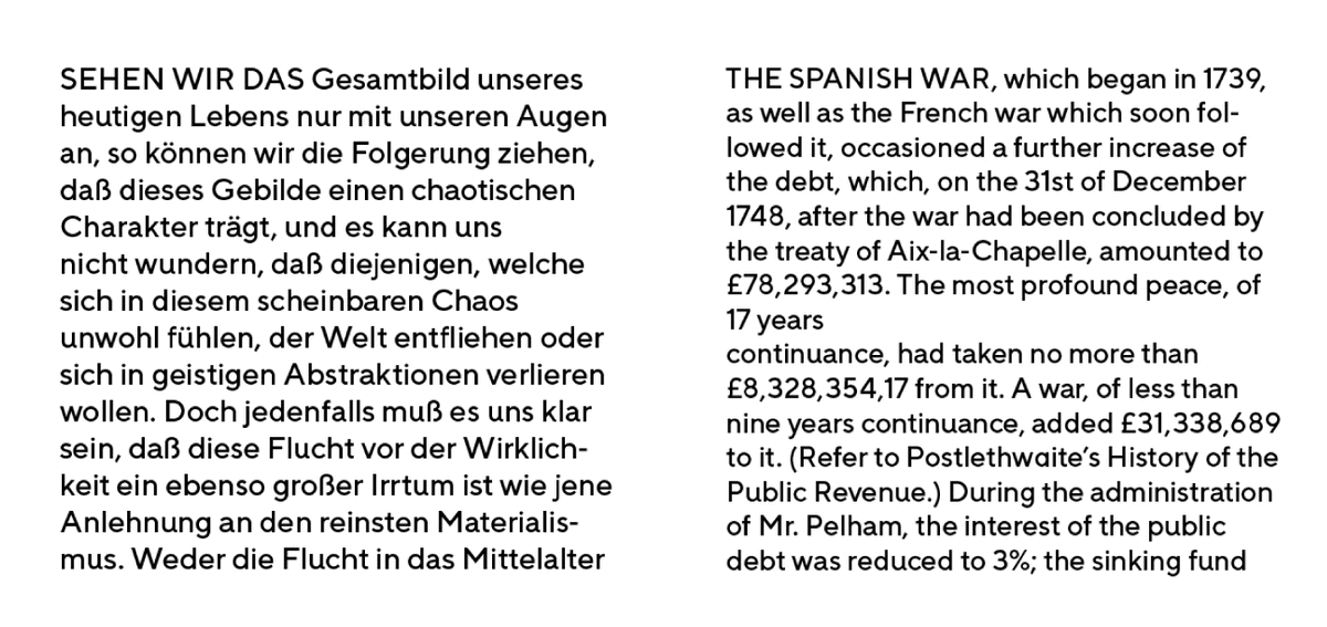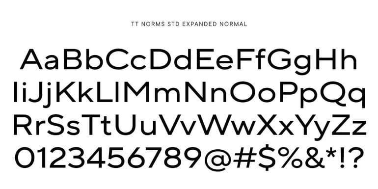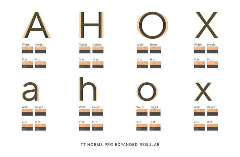 Последующим в очереди был TT Norms® Expanded. Расширенную версию шрифта разрабатывали аналогичным образом, как и узкую. Сначала провели исследование, чтобы определить необходимые параметры для расширения шрифта. Были выбраны семейства, содержащие широкую версию, для дальнейшего анализа. После нескольких итераций были достигнуты оптимальные значения: 110% и 120%, в зависимости от начертания. В этой версии самое жирное начертание было сохранено, так как оно выглядело гармонично.