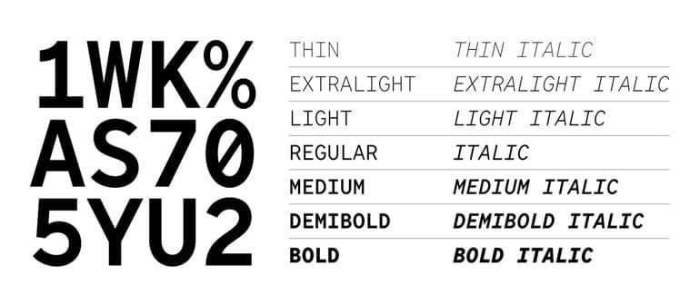 В общей сложности мы создали 7 прямых начертаний и 7 курсивов. Основными стилями были Thin, Medium и Bold. В этом шрифте отсутствуют слишком жирные начертания. TT Norms® Pro Mono дополняет версию 3.0 и представляет собой отдельное подсемейство, хотя и идет в комплекте с ней.