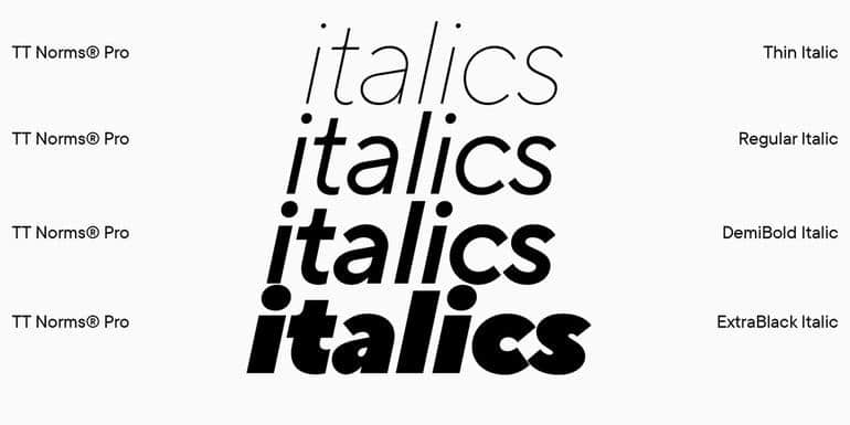Обычно в шрифтах имеется одинаковый набор прямых и курсивных начертаний, что означает, что жирность курсивных начертаний соответствует жирности прямых.
