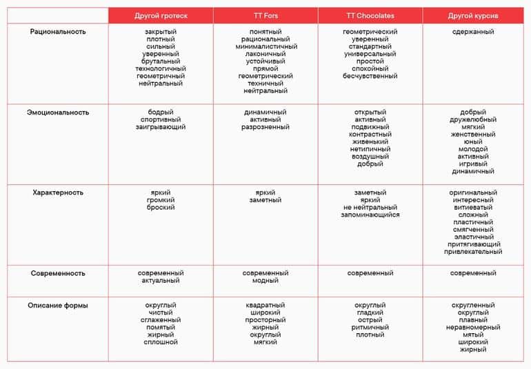 Необходимо было выбрать шрифт из ассортимента TypeType для создания корпоративного набора. Два основных претендента - TT Fors и TT Chocolates - вызвали разногласия среди участников. Чтобы принять решение, было проведено внутреннее голосование среди дизайнеров и людей, не связанных с миром шрифтов. Им предложили описать каждый шрифт тремя характеристиками.
