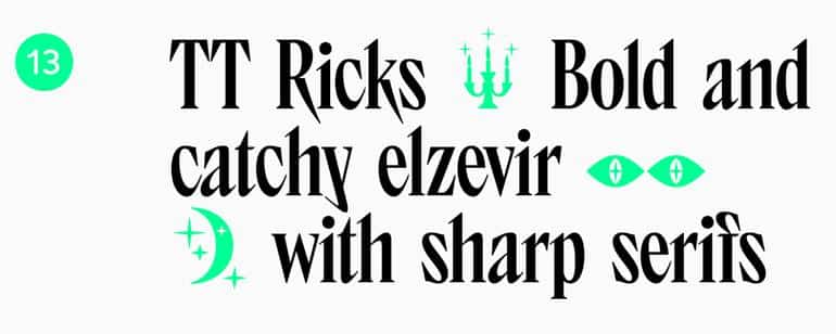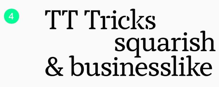 TT Tricks - это еще один современный шрифт, который напоминает стиль переходных антикв. Он отличается квадратными формами овалов, асимметричными и крупными засечками. Этот шрифт идеально подходит для использования в больших объемах текста и особенно подходит для печатной индустрии.