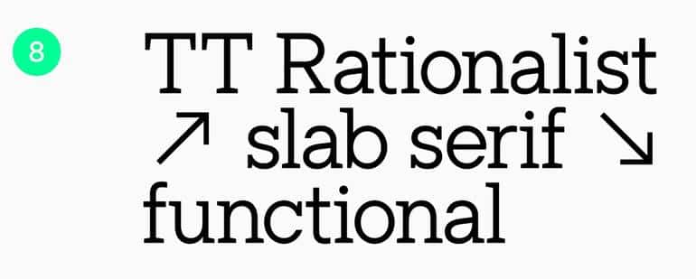 TT Rationalist - это функциональный брусковый шрифт, который входит в коллекцию универсальных гарнитур вместе с популярными шрифтами TT Norms® и TT Commons™️. Отличительной особенностью TT Rationalist являются его трапециевидные и изящные засечки, которые придают шрифту современный вид.