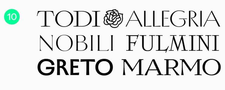 Изысканный и утонченный шрифт, созданный по мотивам надписи, вырезанной на мраморном полу собора во Флоренции. Тонкий шрифт с ярко выраженным контрастом, идеально подходящий для стильных заголовков.