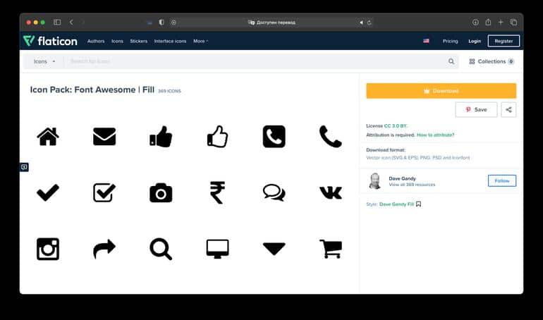 Один из самых популярных среди дизайнеров сайтов для поиска иконок. Здесь представлена огромная коллекция стилистически согласованных наборов, которые можно использовать для создания собственной коллекции иконок для проекта. Ранее все пользователи могли бесплатно загружать иконки в формате .svg, однако теперь такую возможность имеют только пользователи с премиум-аккаунтом. Все еще можно загружать иконки в формате PNG.